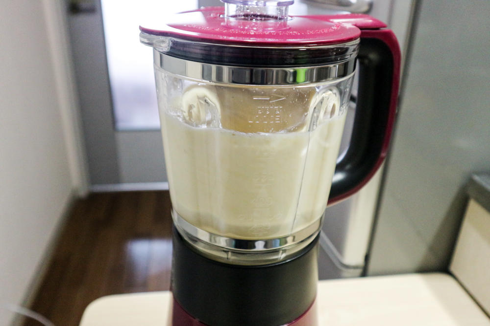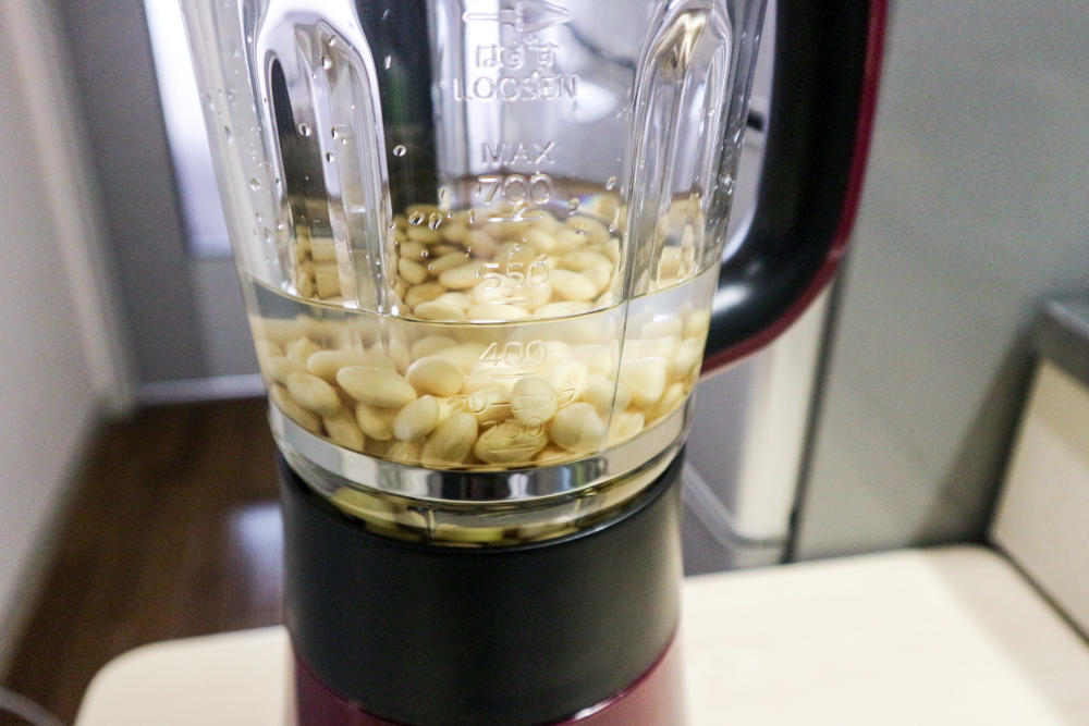 大豆と、大豆を浸した水を一緒に入れます。一気に全部入れてしまうと溢れてしまいそうだったので、今回は2回に分けました。