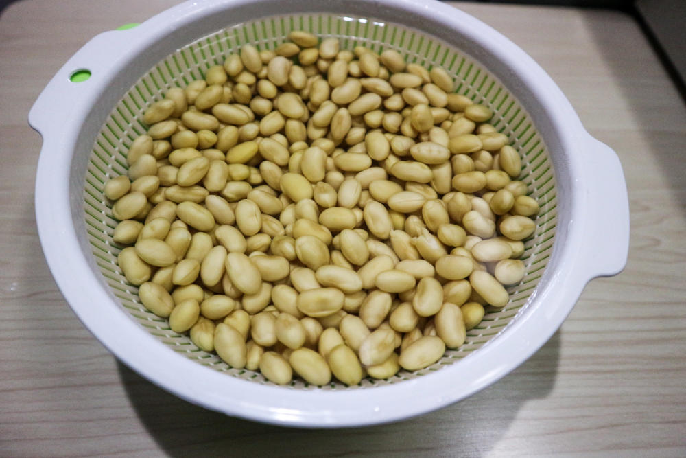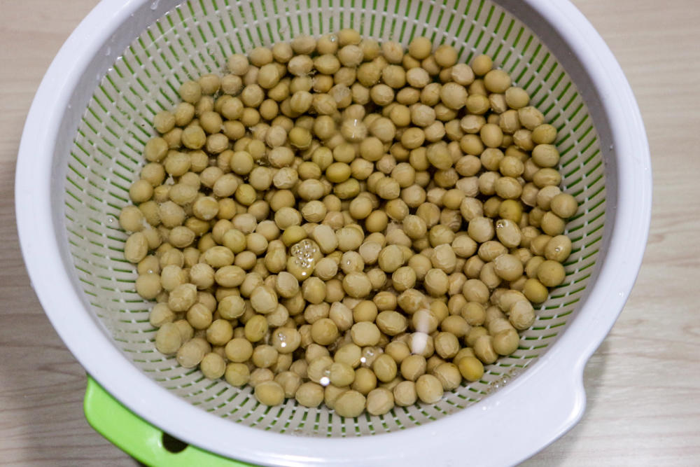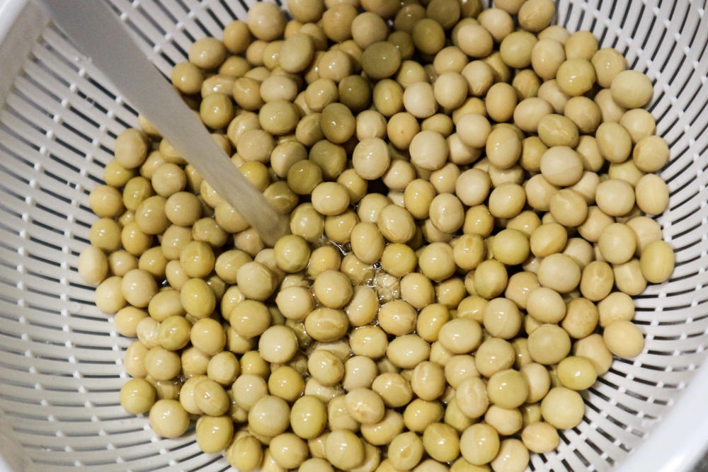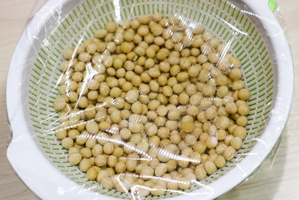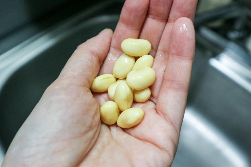 約14時間水に浸けた大豆がこちらです。大豆が水を吸って膨らんでいるのが分かります。