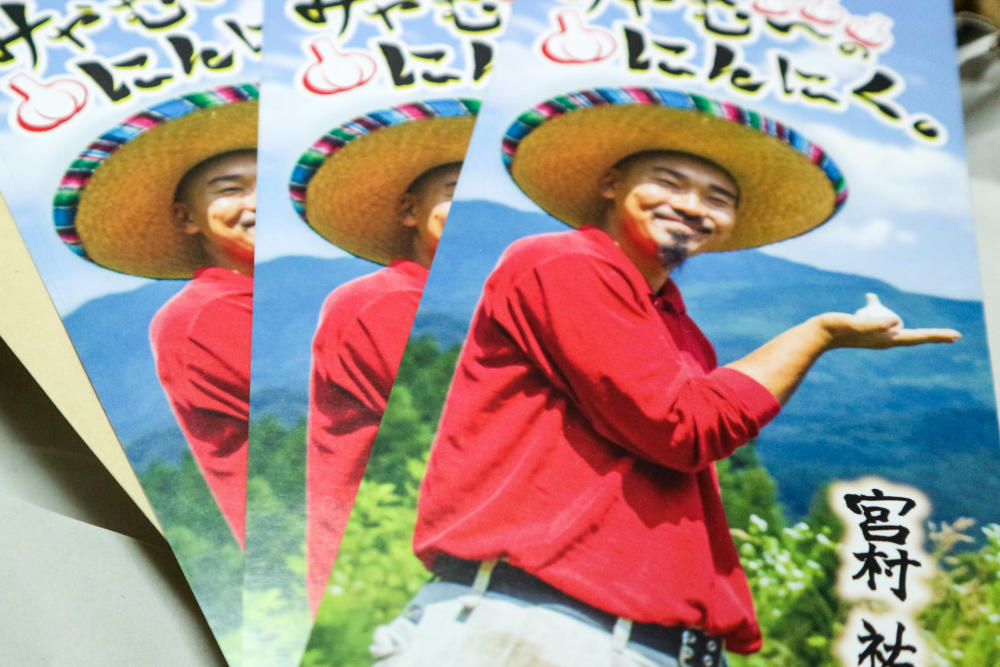 段ボール箱の中には、宮村さんの看板商品「みやむ~のにんにく」の紹介リーフレット。お爺さまから受け継いだ畑を未来に繋げようと奮闘する宮村さんの熱が伝わってきます。