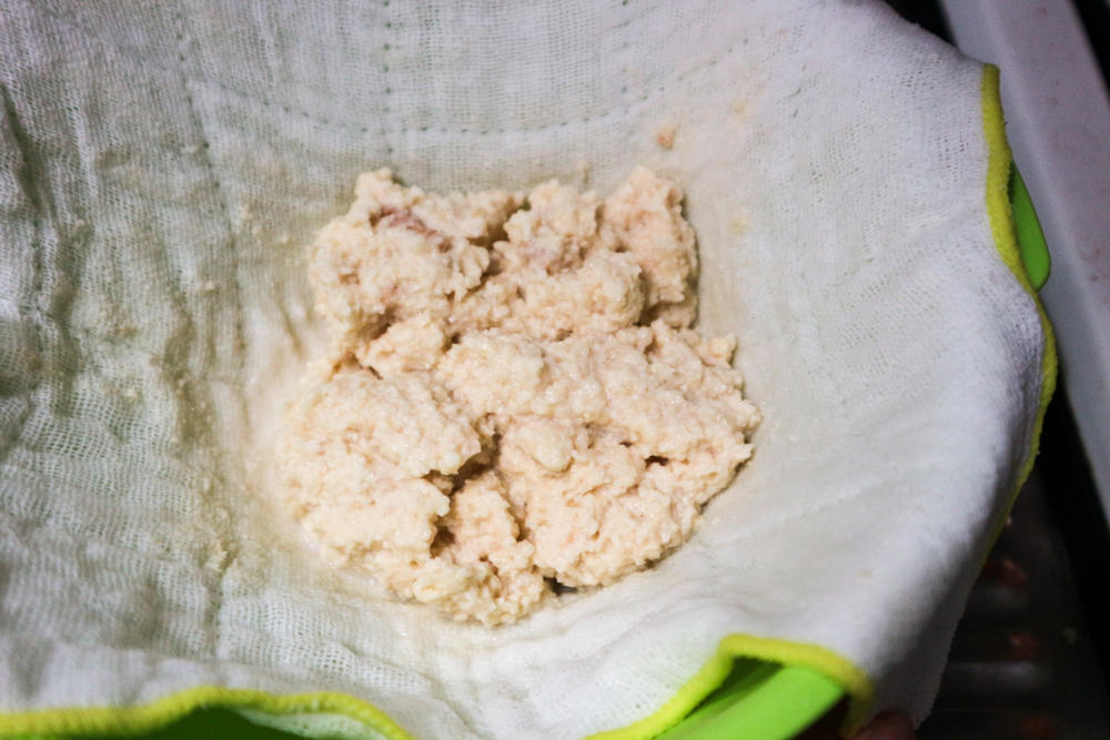 大豆液を布巾にのせる→絞る→おからを移すの作業をひたすら繰り返します。