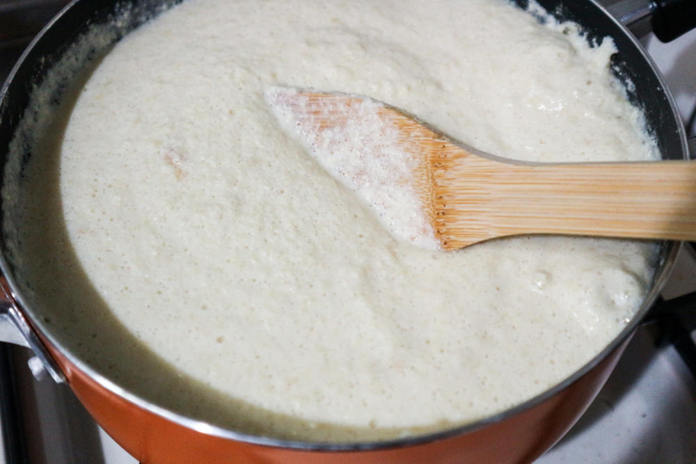 約10分経ち、豆乳独特の甘い香りがしてきたら火を止めます。加熱前より、だいぶフワフワ感があります。
