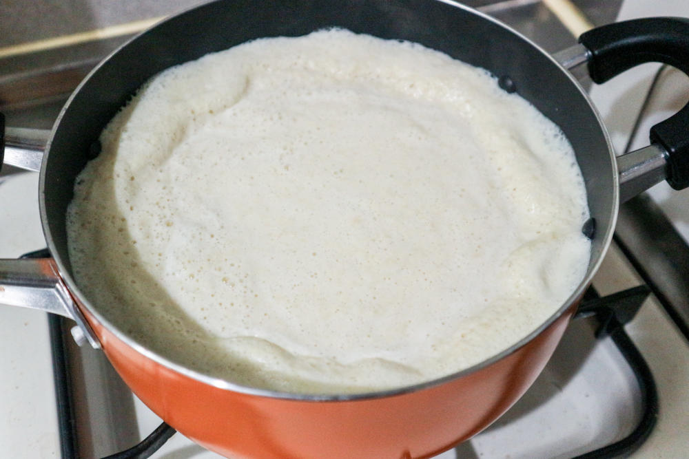 大きめの鍋に入れて中火にかけます。泡がたくさん出てくるので、充分な大きさの鍋がない場合は2回に分けると安心です。