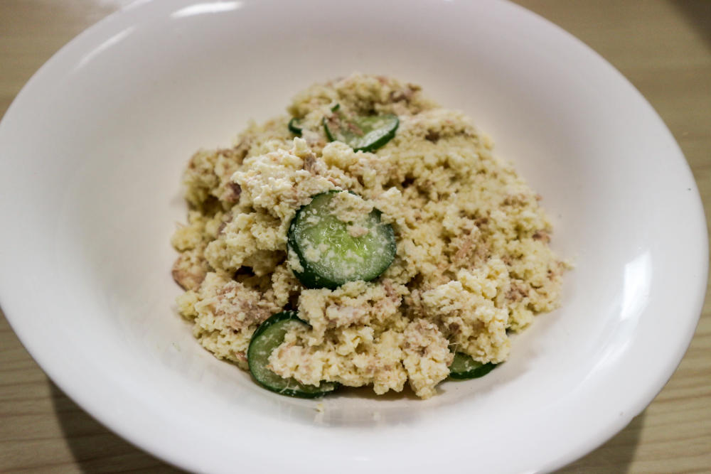 おからを加熱してマッシュっぽくし、薄切りにしたきゅうりとツナをマヨネーズで和えました。意外とボリューミーでお腹に溜まります。