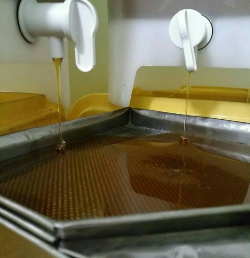 巣枠を遠心分離機にかけるとハチミツが滴り落ちる仕組みになっている