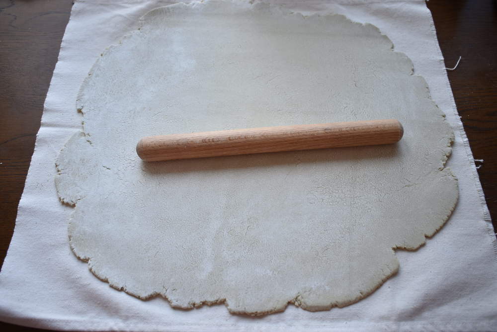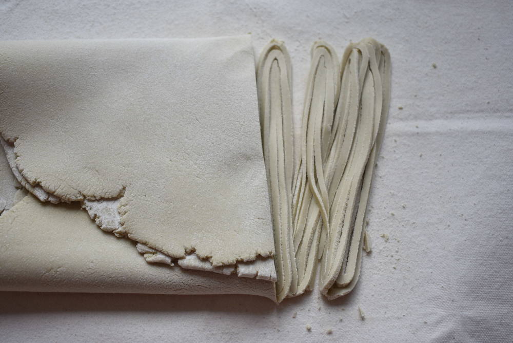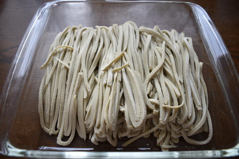 なんとか、そばらしくなりました。麺としての形は整っているようです。すぐに乾燥防止のためにラップをかけて、茹でましょう。