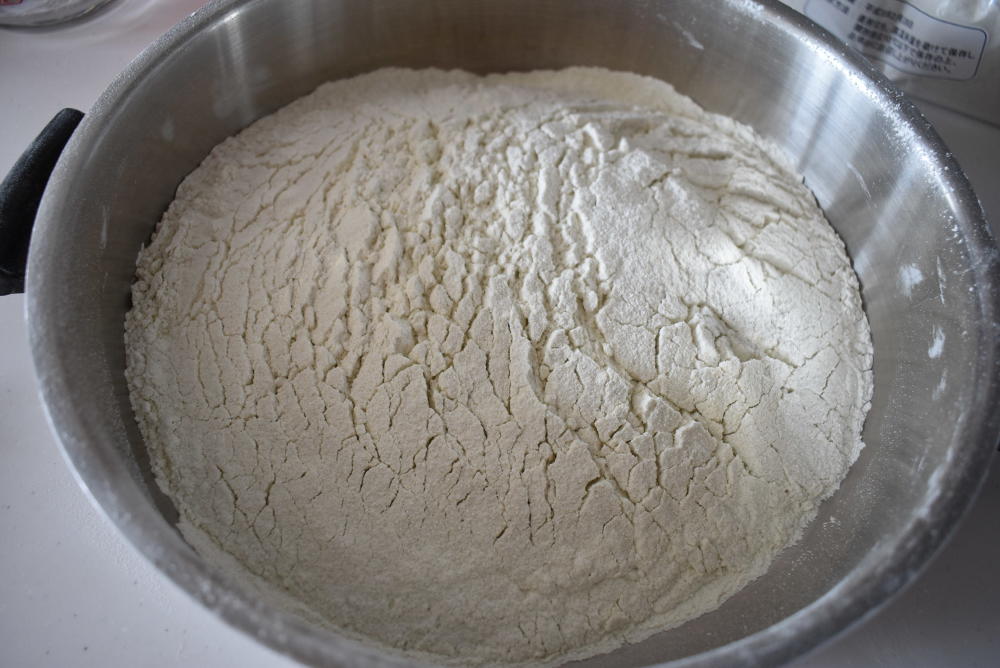 そば粉と小麦粉を量り、ボールへ。よく混ぜます。