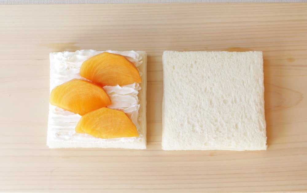 3. ②の食パン1枚にホイップクリームを塗り、①の柿を並べる。さらにホイップクリームを塗り、もう1枚の食パンではさむ。