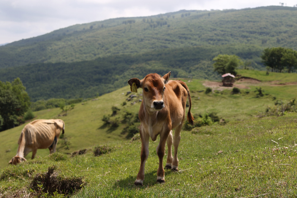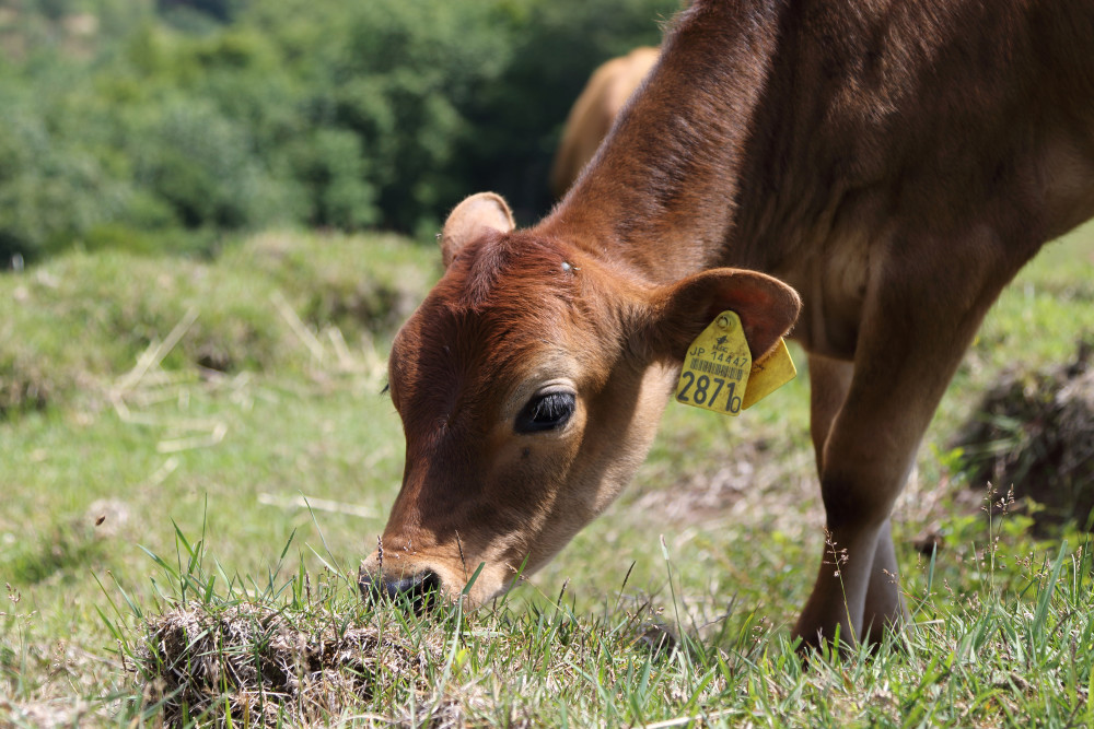 *山地酪農とは:山の斜面を利用して、農薬や肥料を使用せず、自生する野芝主体の野草で飼養する酪農手法のこと。