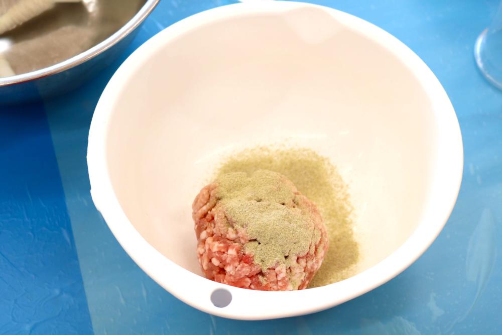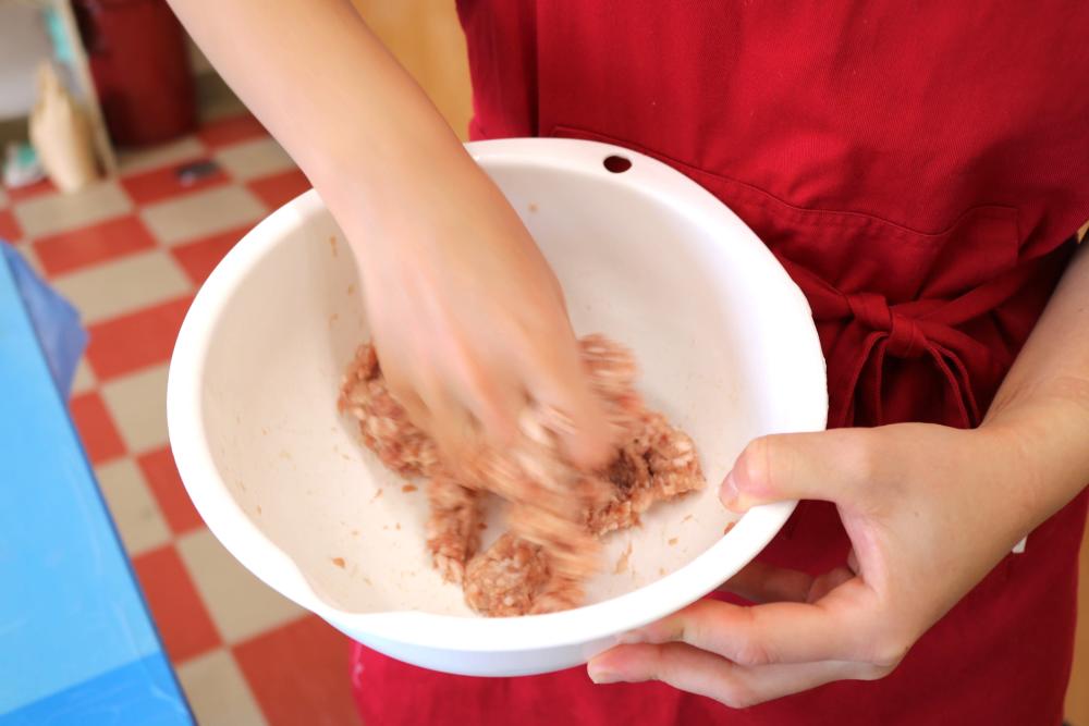 このときのポイントは「背脂を潰さないこと」。じゅわっと溢れる肉汁となる背脂の塊を残すように、手のひらをグーパーしながらざくざく混ぜ合わせていきましょう。
