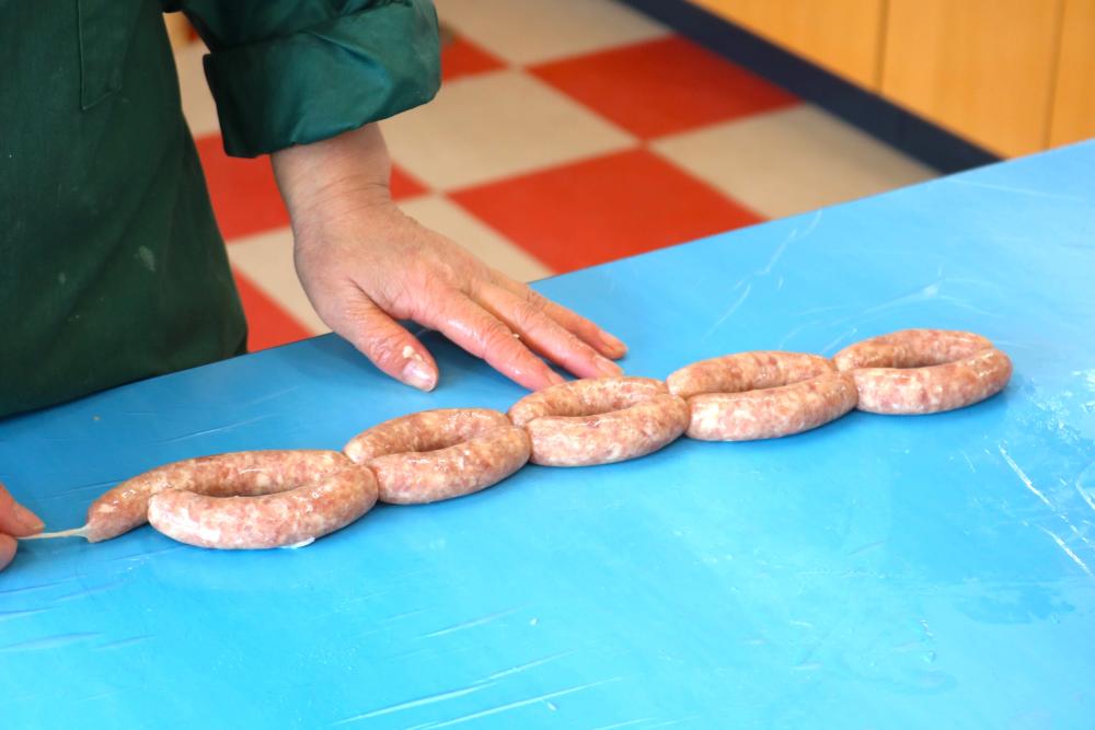 カチカチとハンドルを引きながら、丁寧に腸に詰めていきます。直接アドバイスを受けられるので、この日だけでウインナー腸詰めスキルが向上したのを痛感しました。