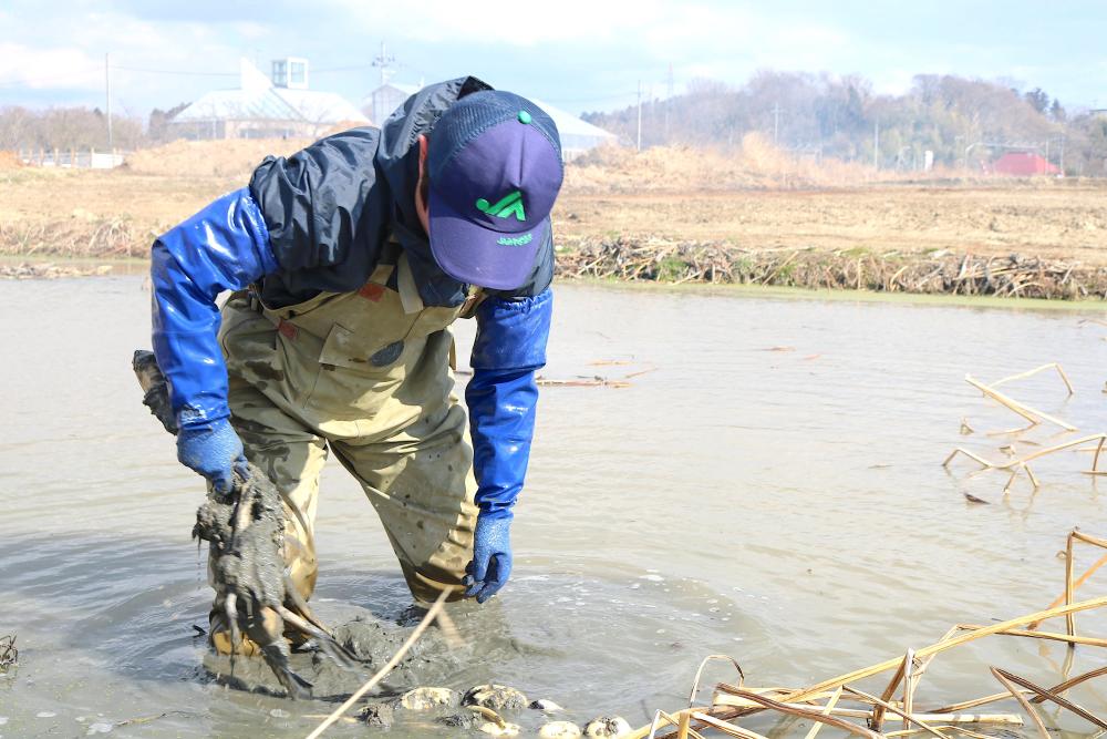 ランチ後に畑に連れ出してくれた伊豆沼農産のご担当者・佐藤さんが発した一言。冬が色濃く残る3月上旬、開墾したてという蓮田でレンコンを収穫している最中の台詞でした。