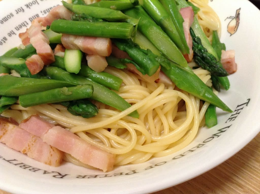 ベーコンと共にバター醤油味パスタでいただきました。たっぷりのアスパラガスが贅沢の極み。ウマウマでした~❤️