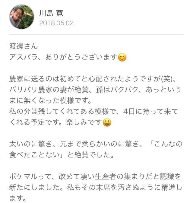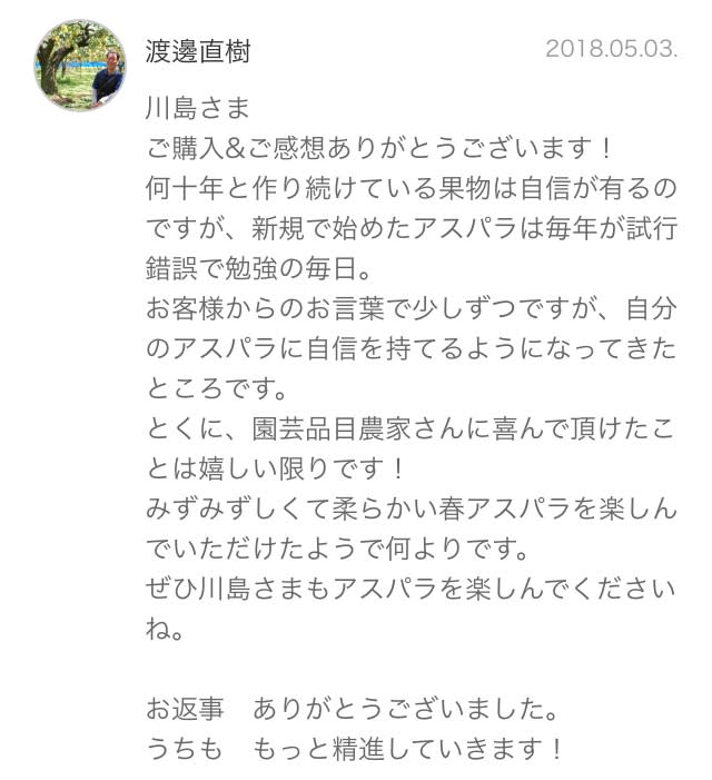 こちらの投稿、実は静岡のイチゴ農家の川島さんから新潟の果樹農家の渡邊さんへのごちそうさま投稿なんです。川島さんの家族もびっくりの美味しいアスパラ……渡邊さんさすがです。