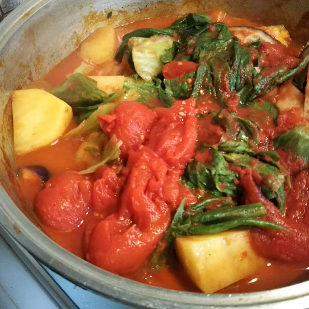ミートボールと野菜のトマト煮込み。冷蔵庫の野菜とグラウンドペチカとタワラムラサキも一緒に。
