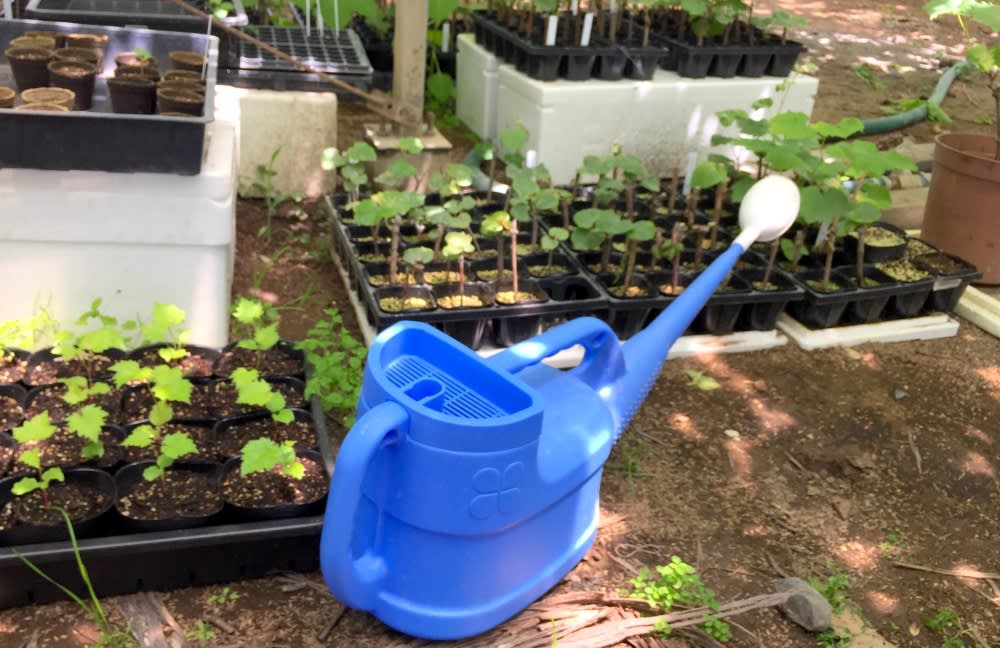 赤ちゃんぶどうにじょうろで丁寧に水をやる。まるでぶどうの保育園だ。