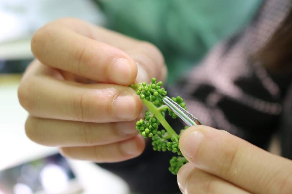 林さんが用意してくれた摘みたてのぶどうのツボミで、葯を取り除く練習をします。