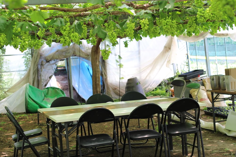 まずはぶどうの下に置かれた椅子に座って事前知識をレクチャーしてもらいます。