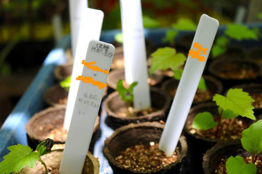 昨年交配させたぶどうから採った種をポットに植えて育てる。