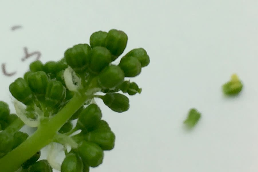 画像中心部分にあるのが除雄し雌しべだけが残ったツボミ。右奥にぼやけているものが取り除いた花弁とその中にある黄色い葯。