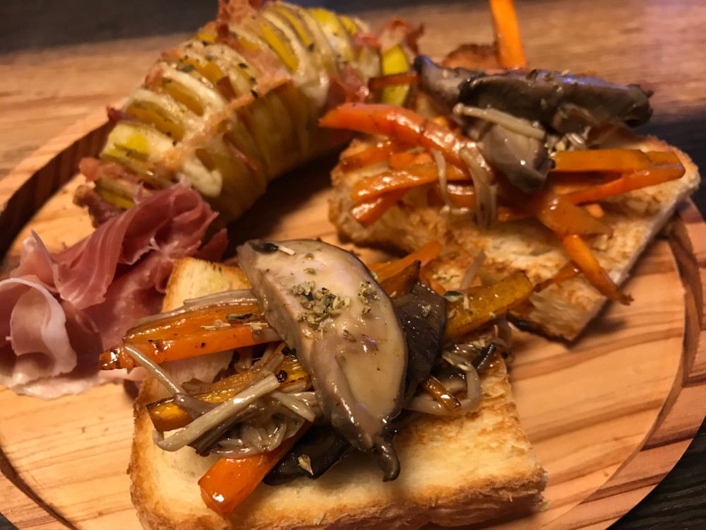 しいたけのオリーブオイル漬けを人参とアレンジして、カリカリパンに乗せてみました😊 ブルースさんお手製のプレートに乗せると、とっても美味しそう❤️ 贅沢な食卓をありがとうございます😊