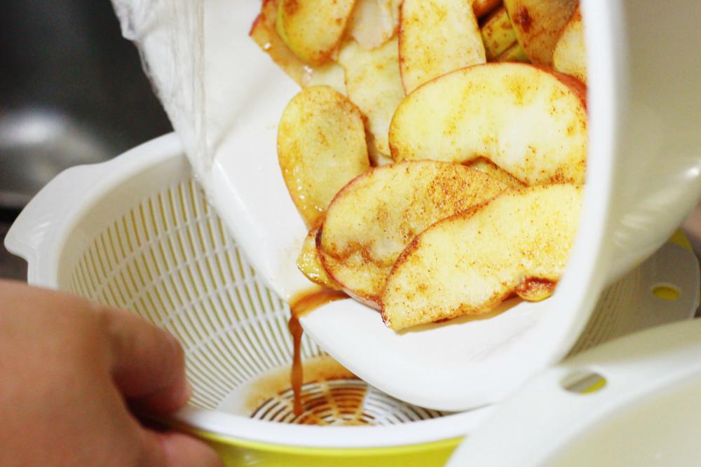 ここで、レンジでチンしていたスライスリンゴを取り出します。リンゴから出ている汁をとりわけて……