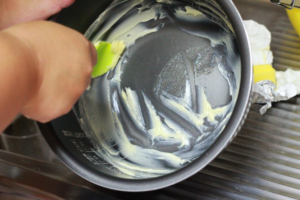 ついに、炊飯器の登場です。まず、常温に戻しておいたバターを炊飯釜の壁に塗ります。