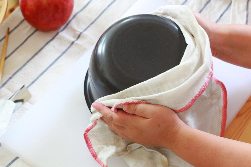 全体が均一になるように整えてから、炊飯釜を5センチくらいの高さから丈夫な台の上に2〜3回落として生地の中の空気を抜きます。