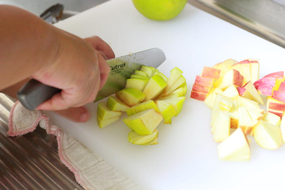 スライスしなかったもう半分のリンゴを、赤青それぞれいちょう切りにします。