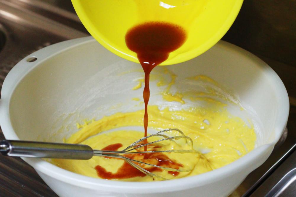 生地にリンゴ汁を投入して混ぜます。