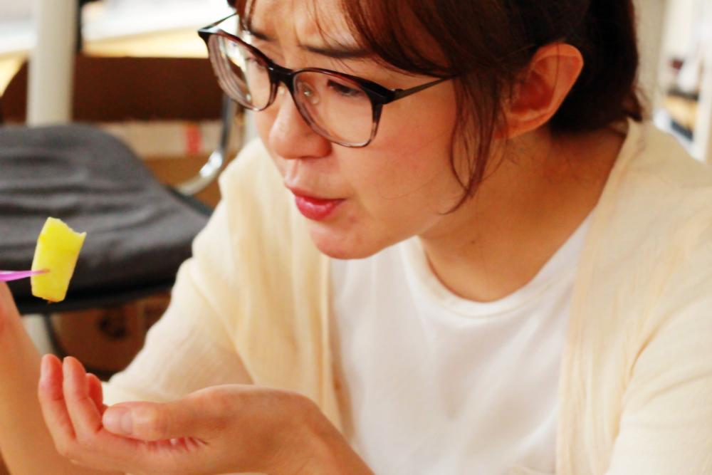次にサンつがるを実食。うん、ちゃんと甘い。私の知っているリンゴの味はこれだ、これ。一口にリンゴといっても、こんなに違いがあるんだ……。リンゴの世界は奥が深い。