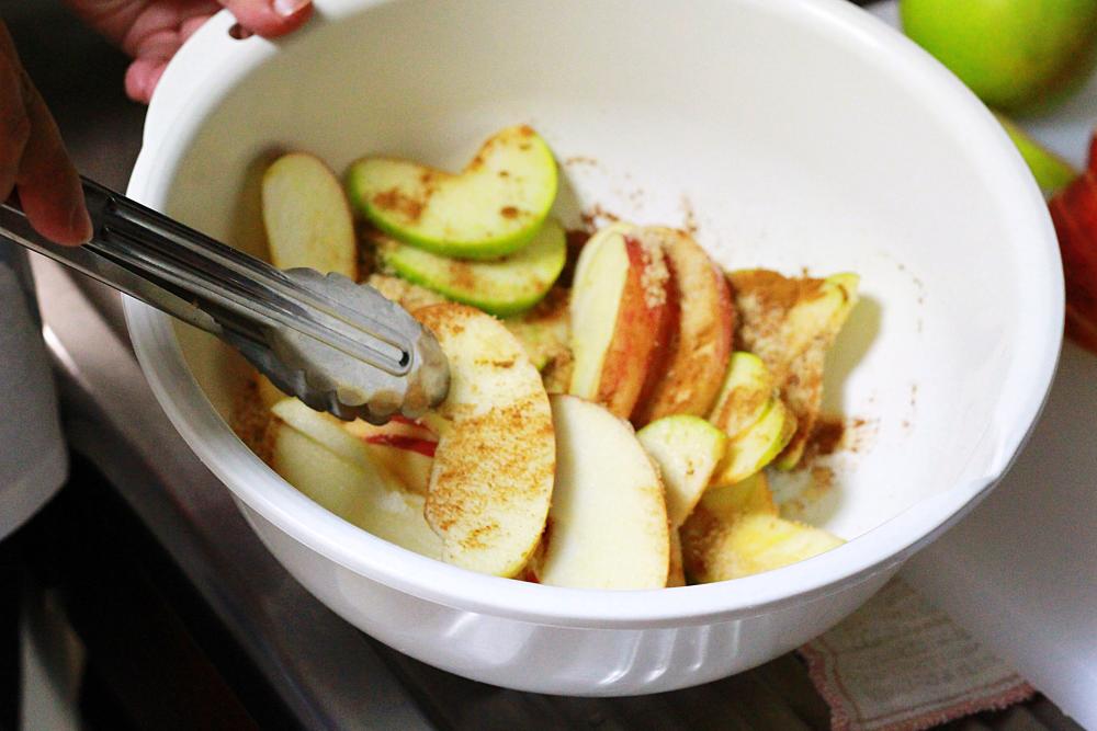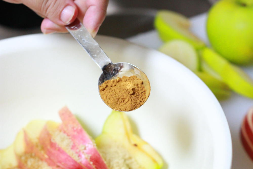 ②スライスしたリンゴにシナモンパウダーと砂糖Bをまぶしてレンジで温める