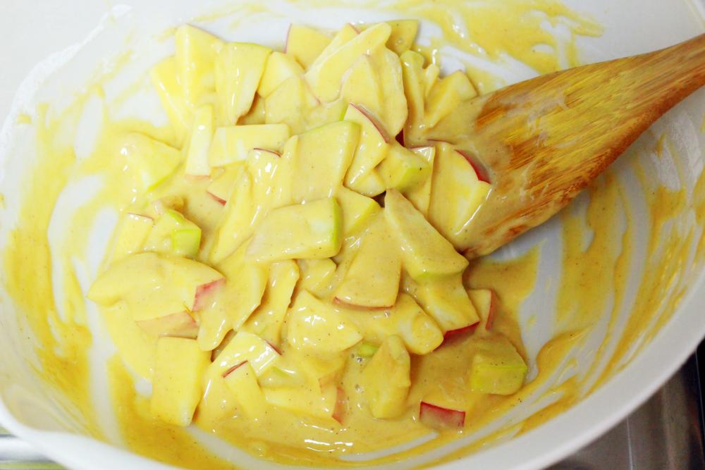 最後にイチョウ切りにしたリンゴを投入して木べら等でサクッと混ぜて、生地の完成です。