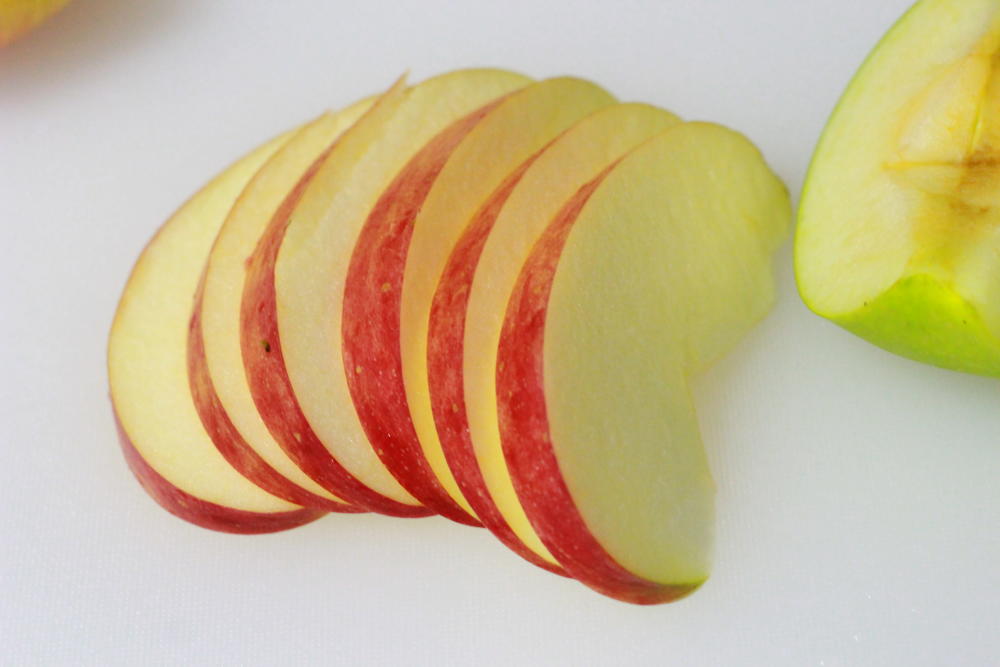 4等分に切ったリンゴのうち、赤青それぞれ半個分を厚さ5mm程度にスライスします。