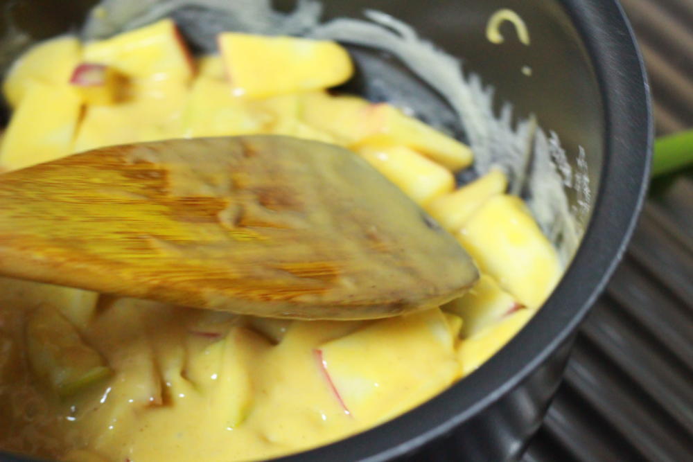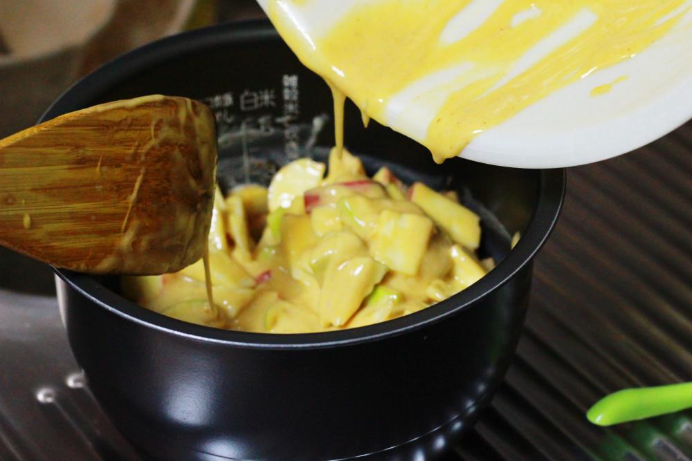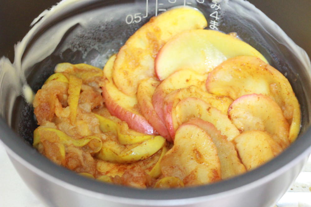 ④炊飯器にリンゴと生地を入れて炊く