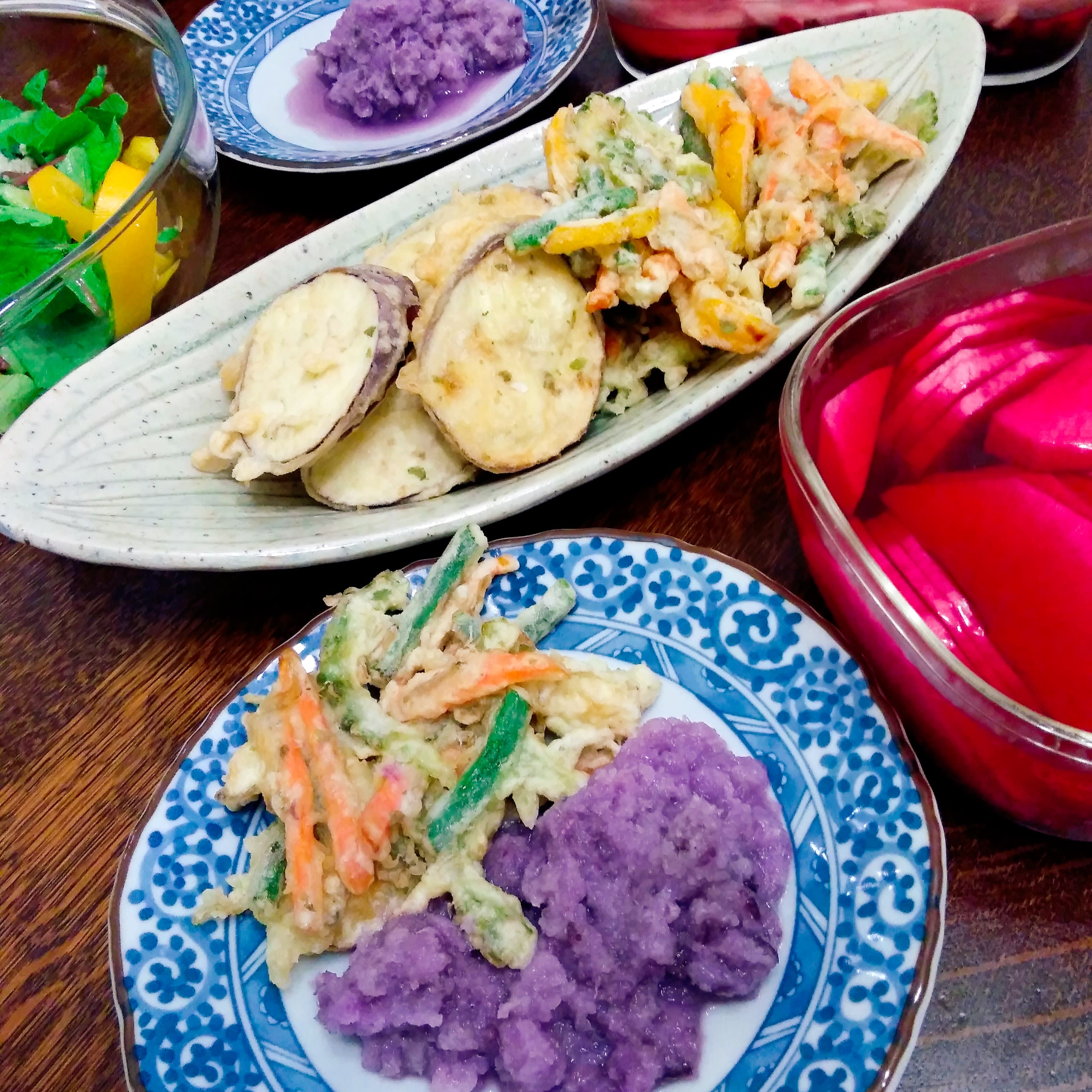 芝田さんの野菜を用いた料理:①恋みどりインゲンとゴーヤのかき揚げ②茄子の天ぷら③紫の大根おろし
