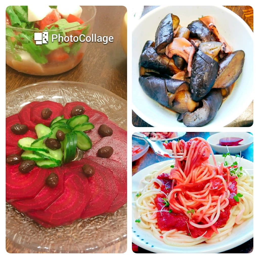 芝田さんの野菜を用いた料理:①ビーツのサラダ②ビーツの皮&茎のパスタソース