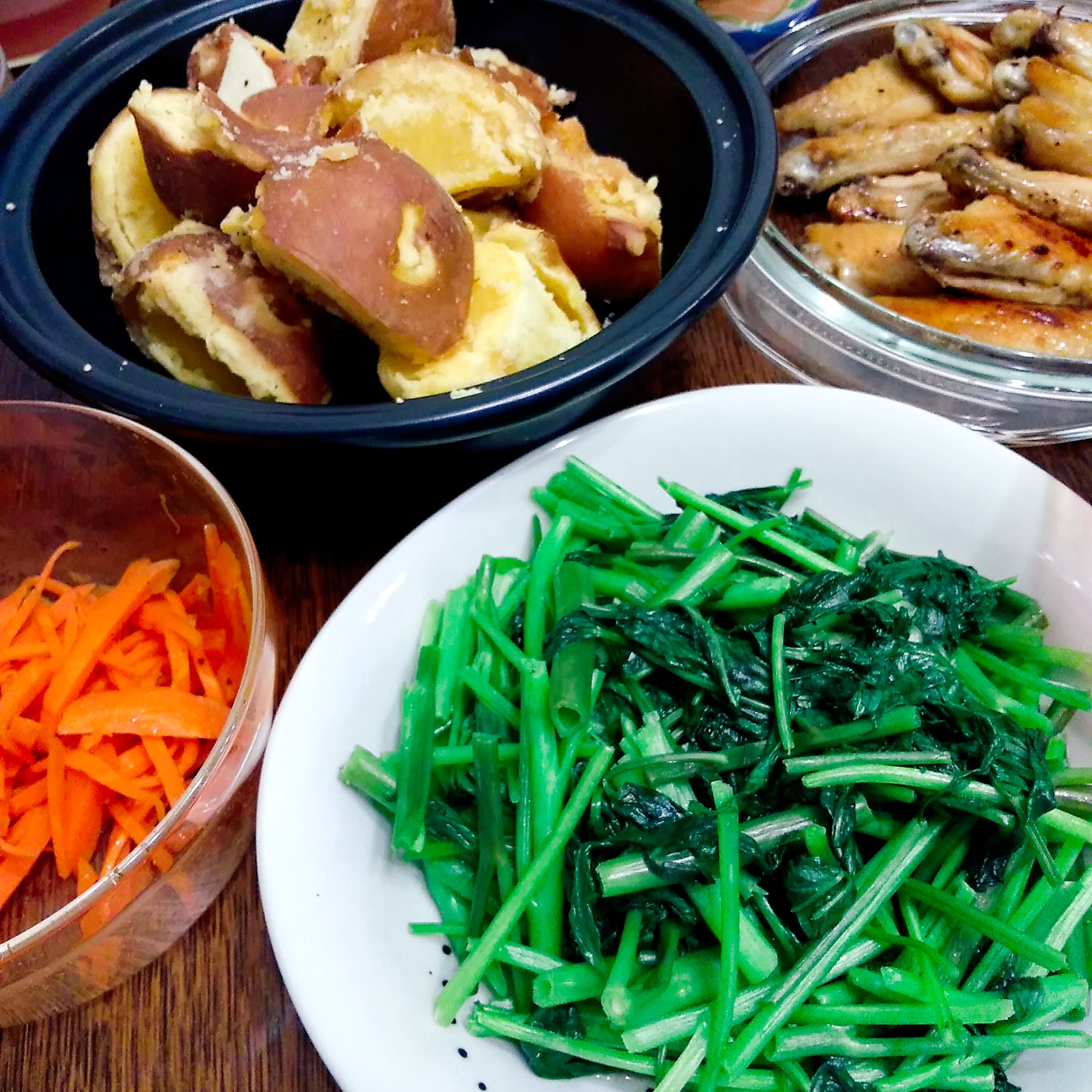 芝田さんの野菜を用いた料理:①空心菜の炒め物②皮ごと茹でじゃがいも
